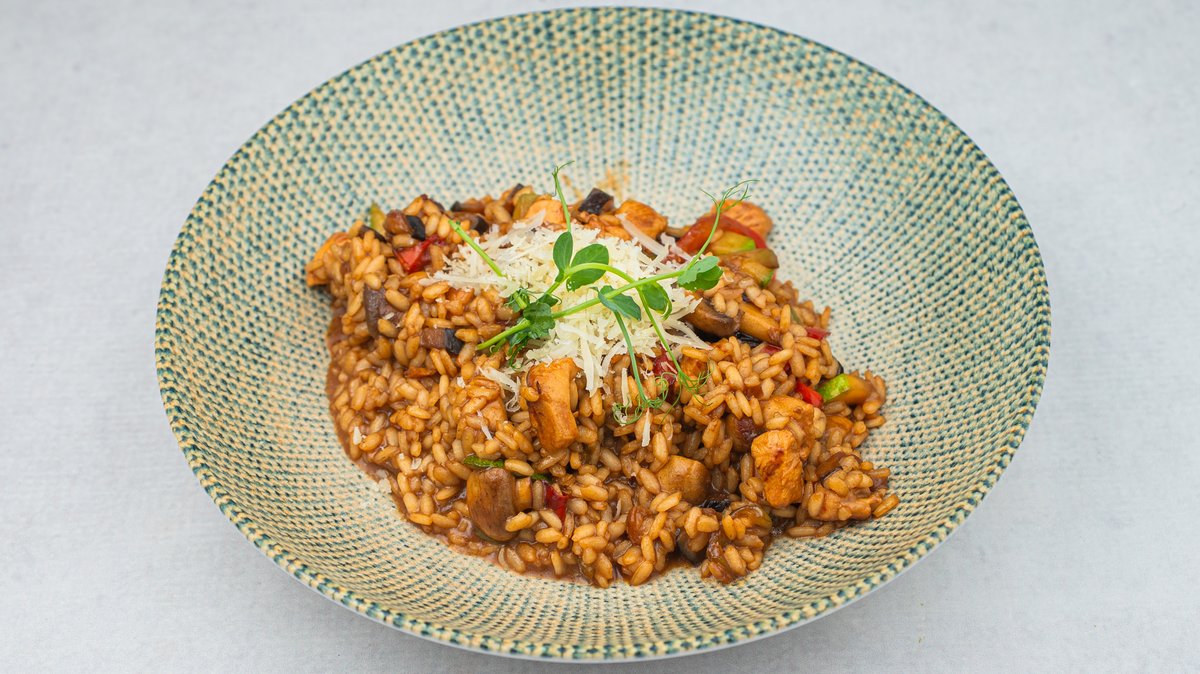 arborio pirinač, tikvica, paprika, piletina, šampinjoni, patlidžan, soja sos, parmezan, puter.