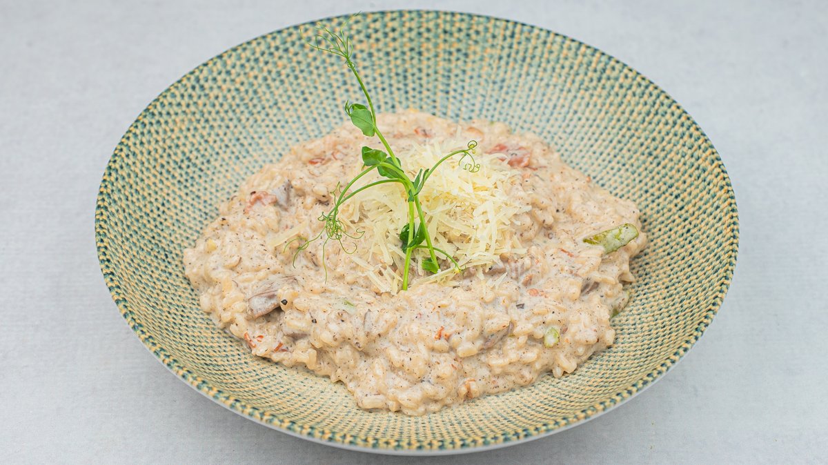 Arborio pirinač, pančeta, sos od kajmaka, pirotski sir, tostirani čvarci, puter, parmezan