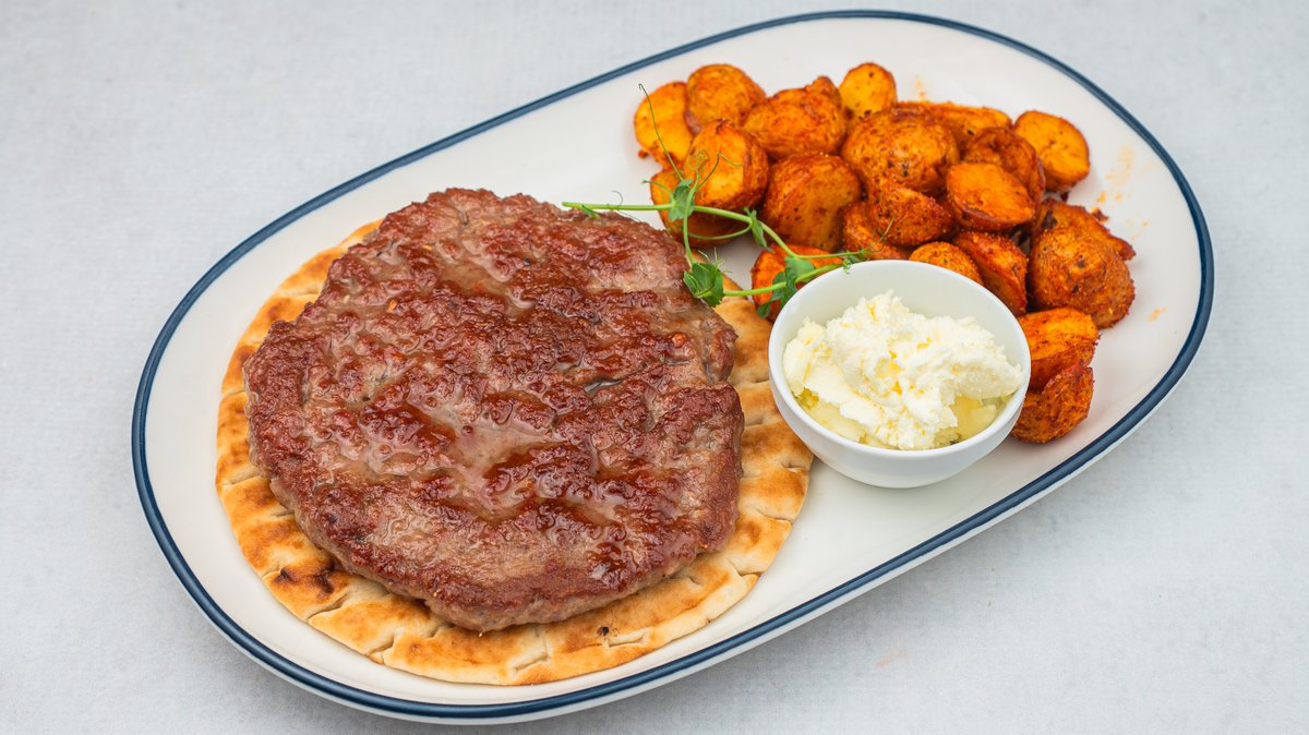 Juneće meso sa crnim lukom, na domaćem testu, sa kajmakom i pikantnim krompirićima.