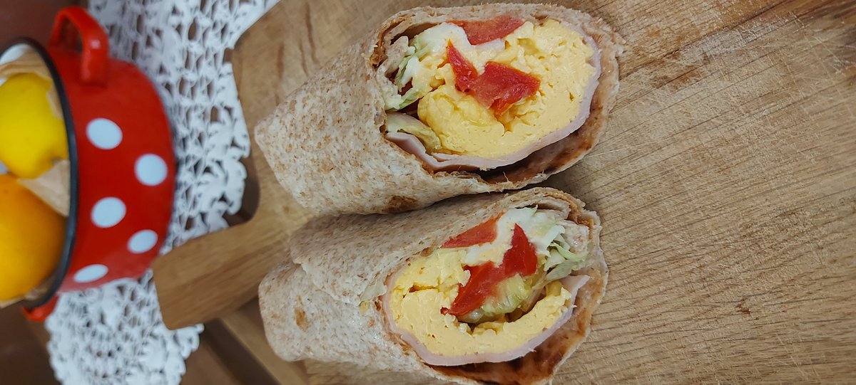 Integralna tortilja,zelena salata,pančeta,kajgana,paradajz,feta
