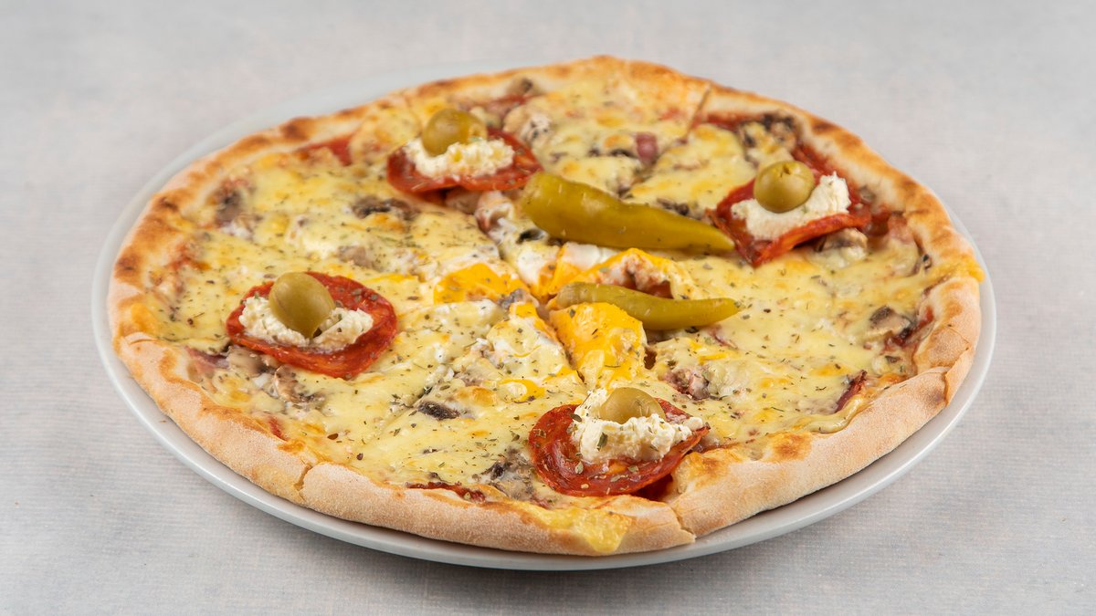 pelat, šunka, pečurke, kačkavalj, pančeta, feta sir, origano, feferone, masline