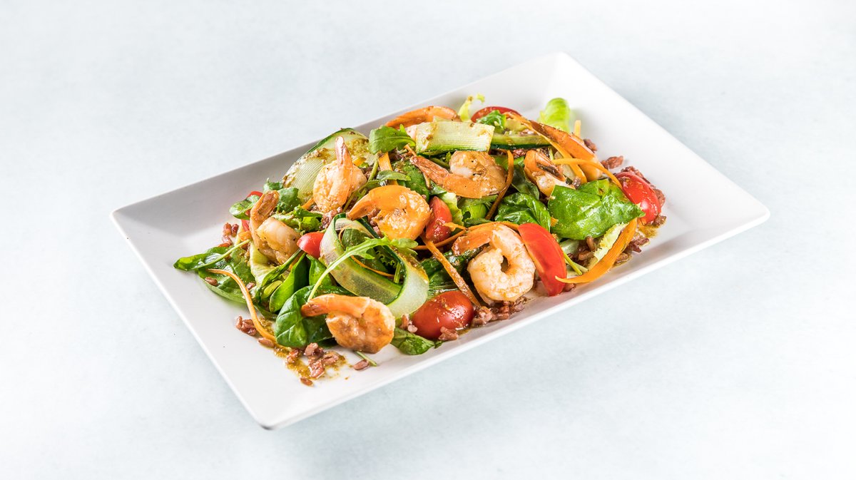 Letnja salata sa toplim mariniranim očišćenim gamborima, putericom, pecnutim kukuruzom šećercem, cherry paradajzom , ljubicastim lukom I dresingom na bazi svežeg limuna