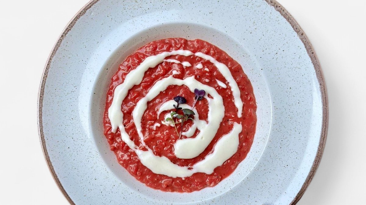 Hrskavi Arborio pirinač u kremi od pečene cvekle I putera, preliven topljenim brie sirom