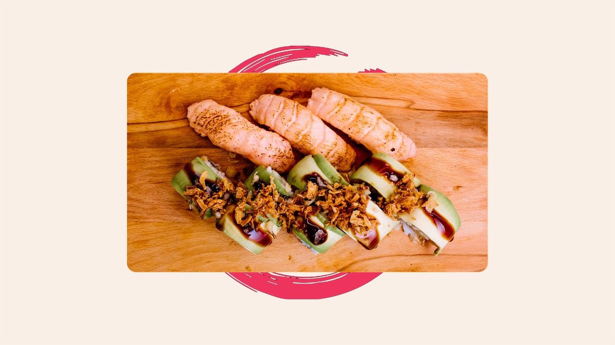 8 zalogaja, torpedo škampi, krastavac, omakase mayo, avokado, unagi, hrskavi luk