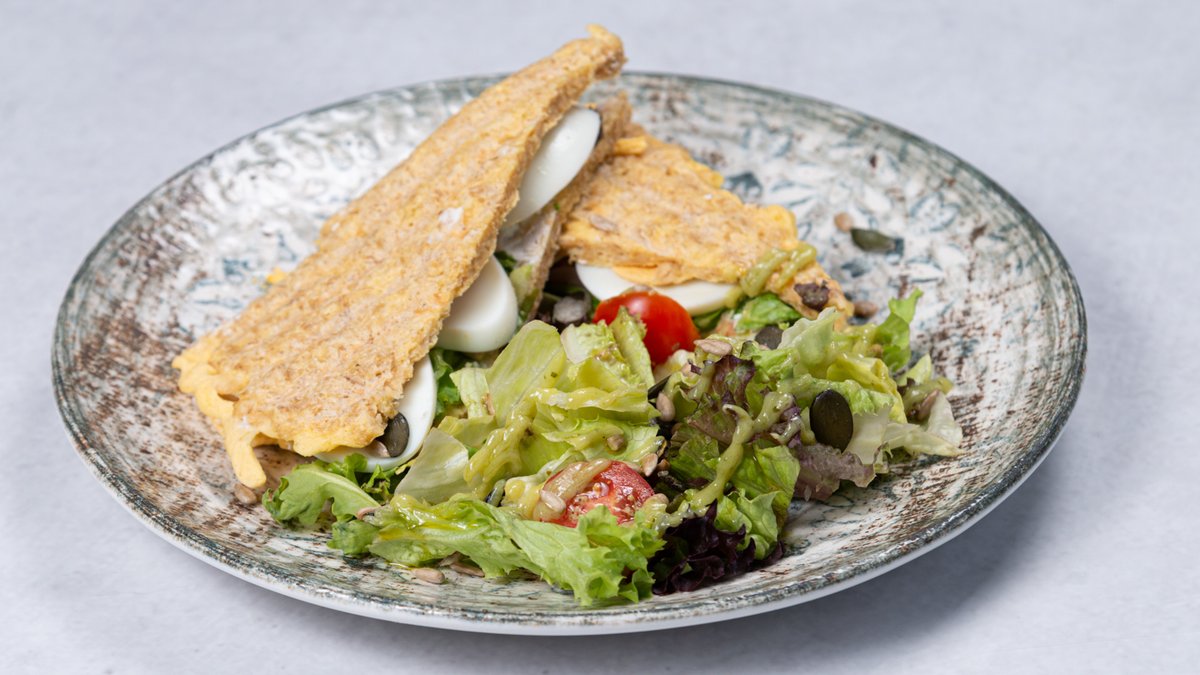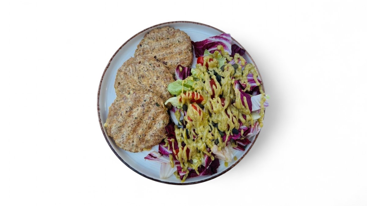 Pljosnate ćuftice od tunjevine, ovsenih pahuljica i jaja. Prilog miks svežih salata, cherry paradajz, domaći pesto vinaigrette dresing, semenke