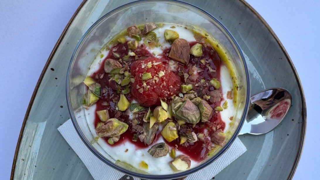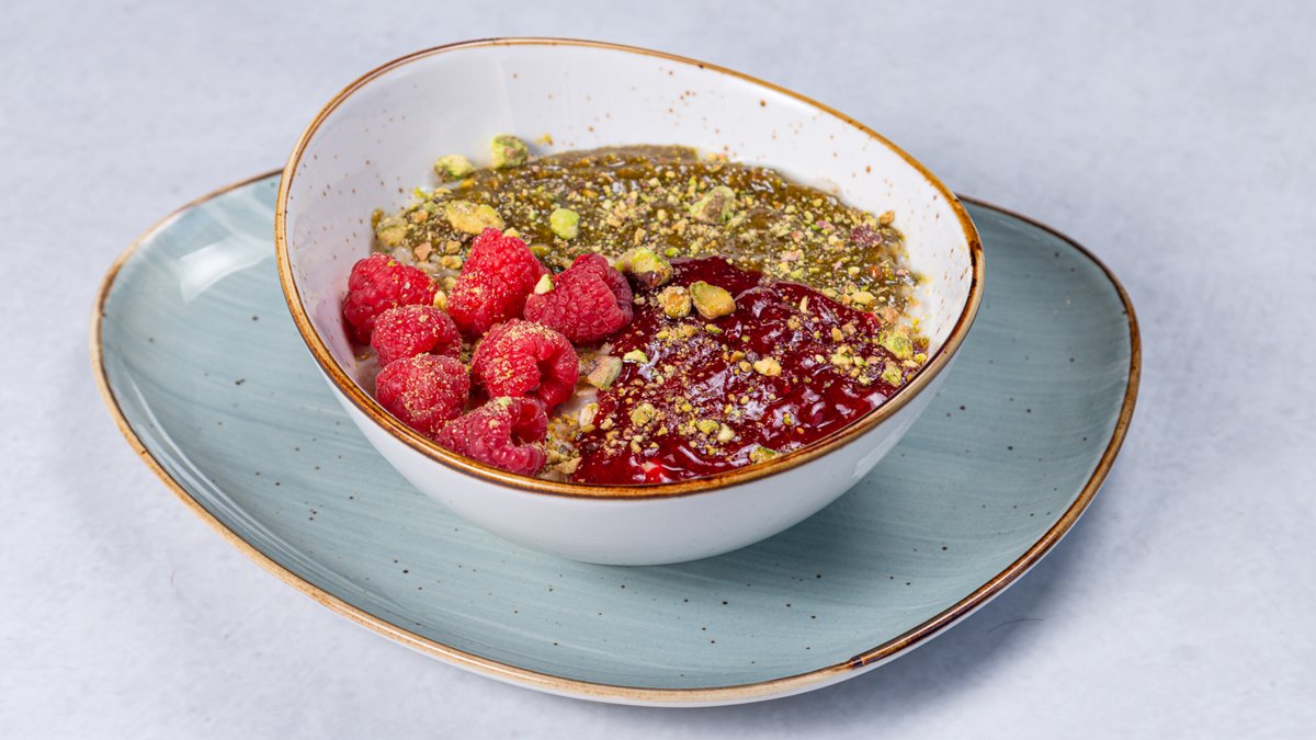 Ovsena kaša, Oat Bar pistać krem, malina sos, bela čokolada, sveža malina, seckani pistaći
