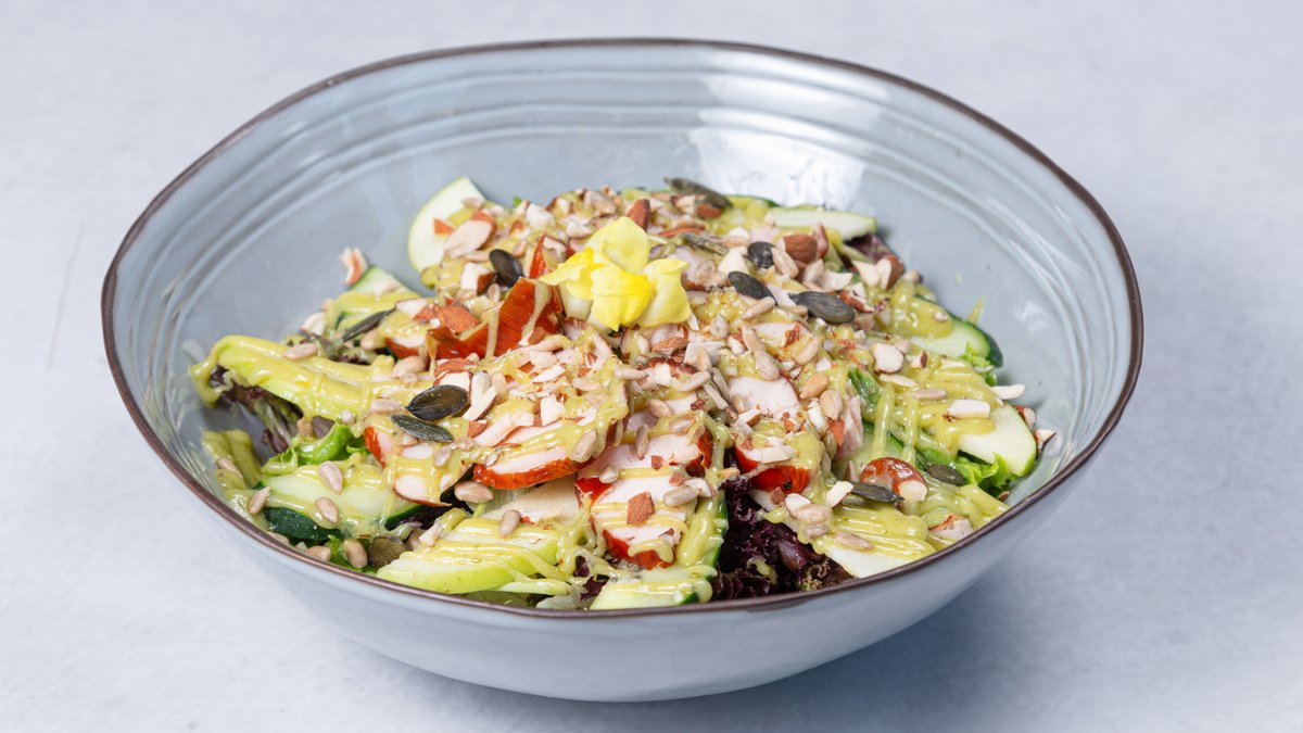 Mix salata, Krastavac, Jabuka, Dimljena piletina, Avokado dresing, Badem, Semenke