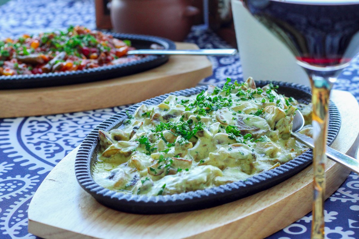 Kapice šampinjona punjene sulguni sirom, zapečene u furuni