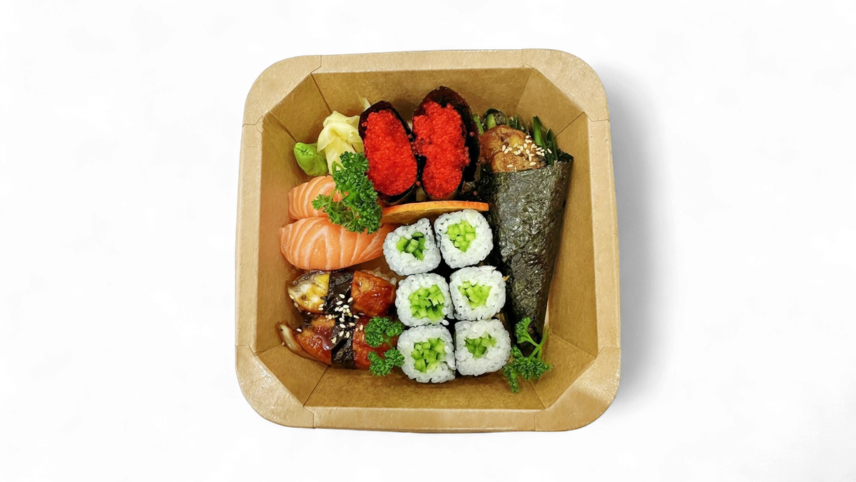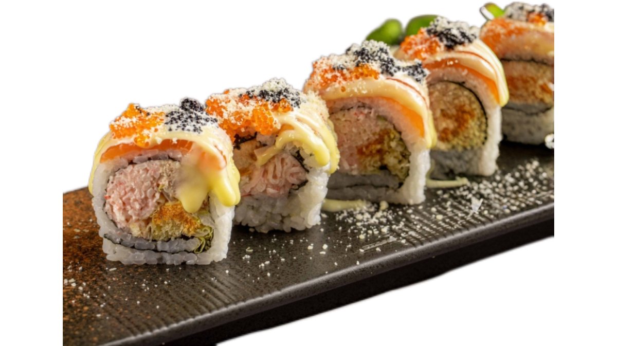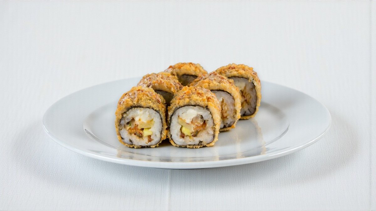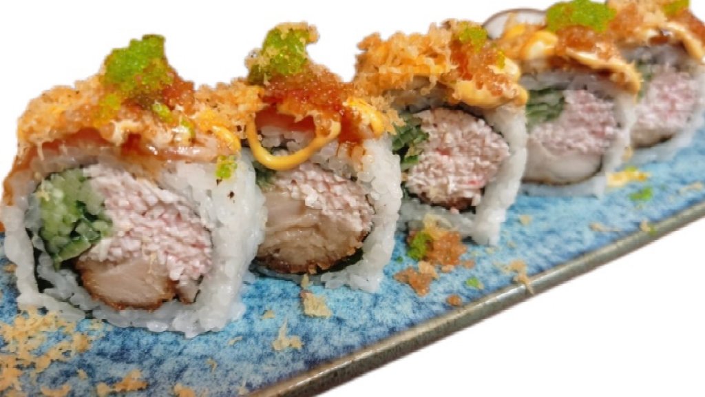 U rolu se nalaze: losos, tuna, krabov štapić, pržena piletina, krastavac, tempura mrvice, ikra od rakova.(Za sve vrste sushija besplatno se dostavljaju sushi sos, wasabi i ukiseljeni đumbir.)