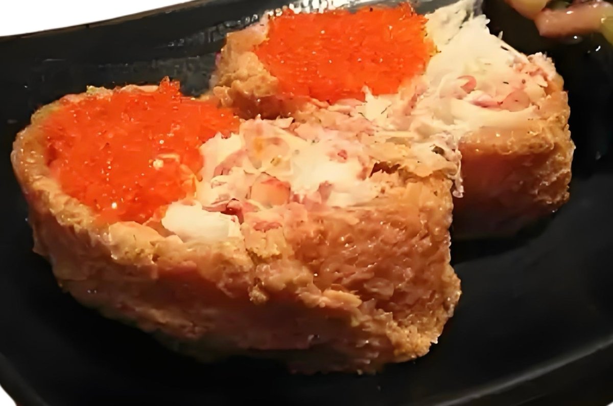 U rolu se nalaze: pržena piletina, avokado, krabov štapić, krastavac, ikra od rakova. (Za sve vrste sushija besplatno se dostavljaju sushi sos, wasabi i ukiseljeni đumbir.)