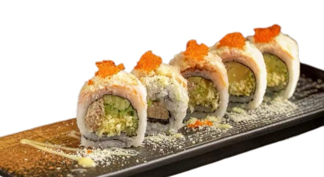 U rolu se nalaze: avokado, tempura kozice, krastavac, ikra od rakova. (Za sve vrste sushija besplatno se dostavljaju sushi sos, wasabi i ukiseljeni đumbir.)