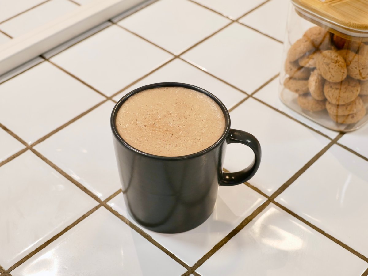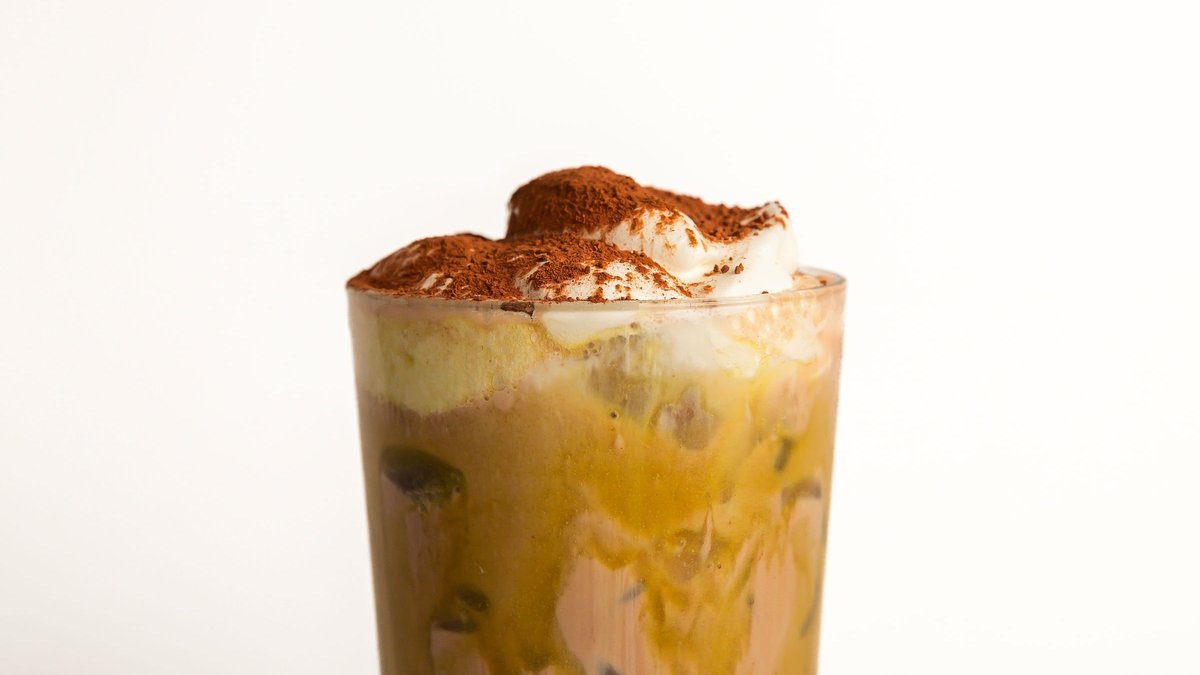 Dubai Chocolate Cocoa — rich cocoa with pistachio cream and a fluffy whipped cream topping. Caffeine-free, but you can add an espresso shot if you like.