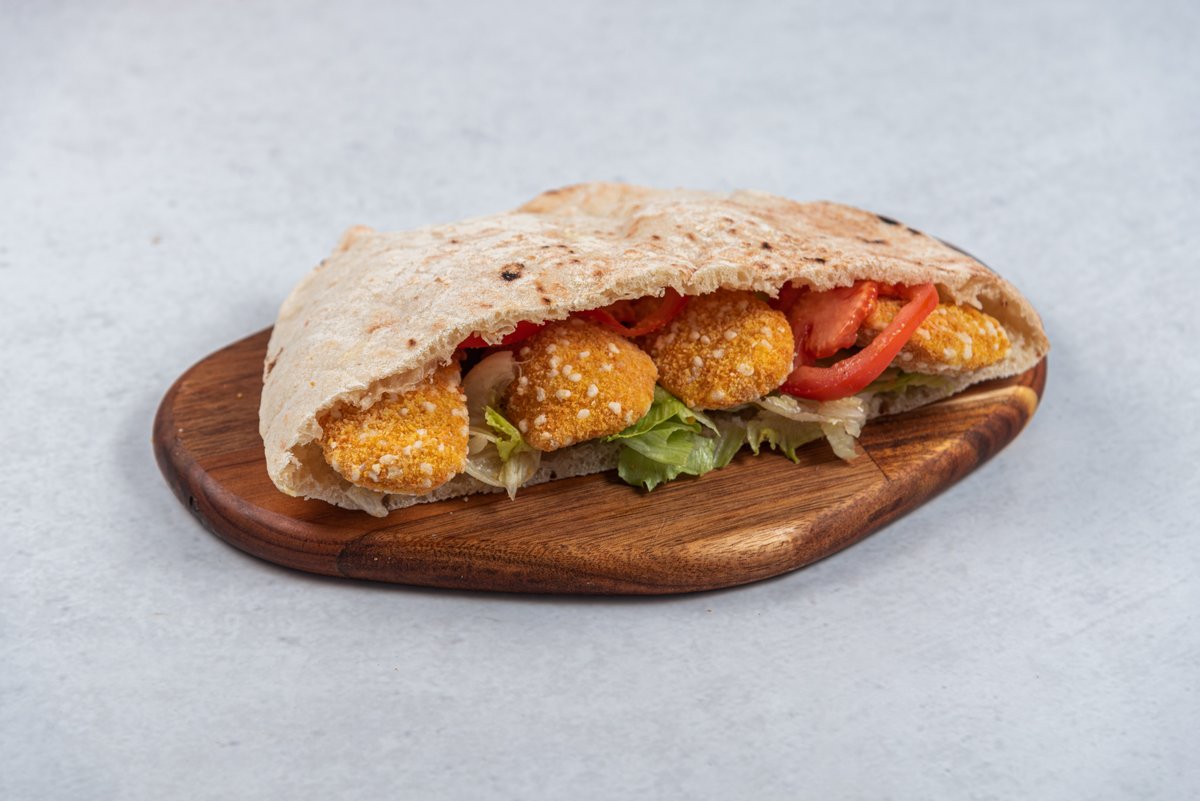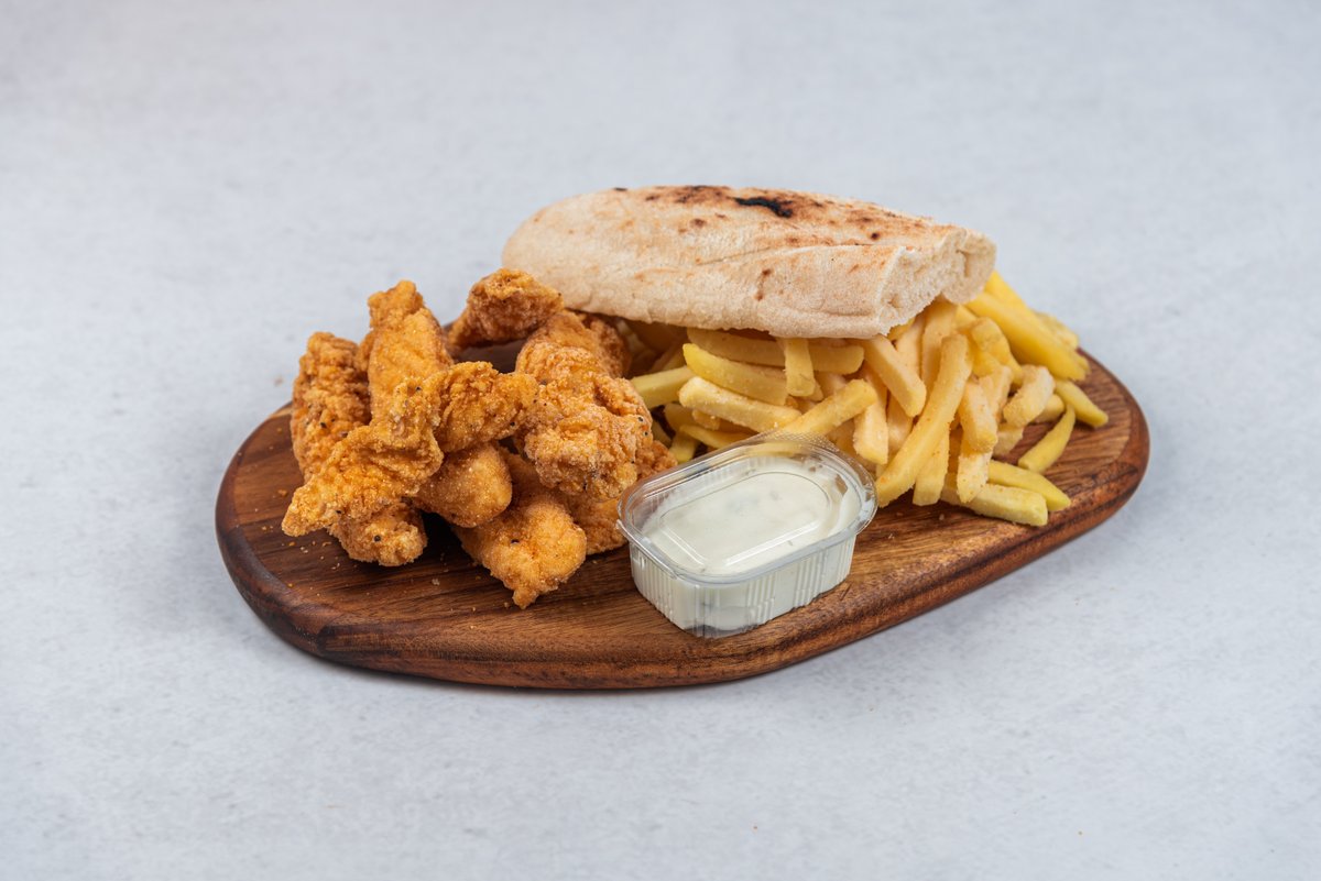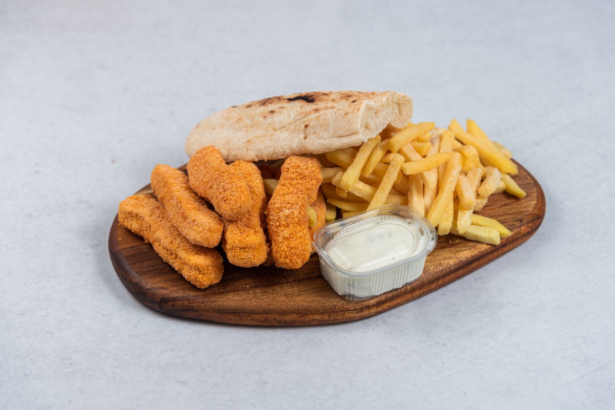Pileći stiks 200gr, pomfrit 150g, pola lepinje, tartar sos 50g