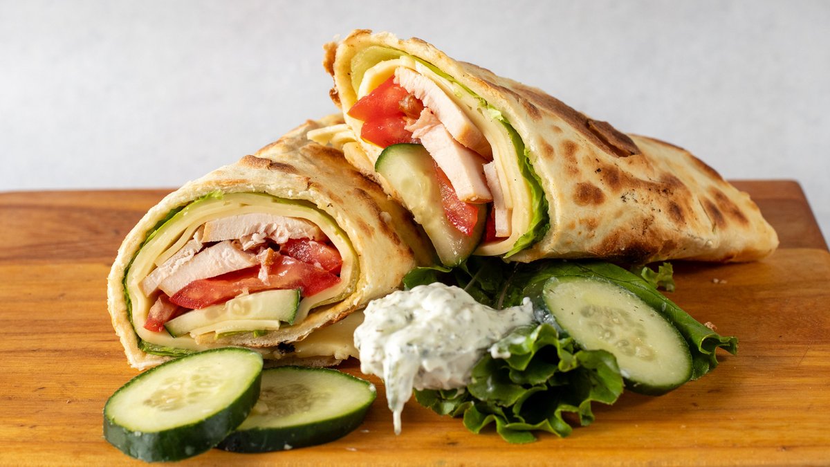 Tzatziki sos, dimljena piletina, kačkavalj, iceberg salata, krastavac, paradajz, pomfrit