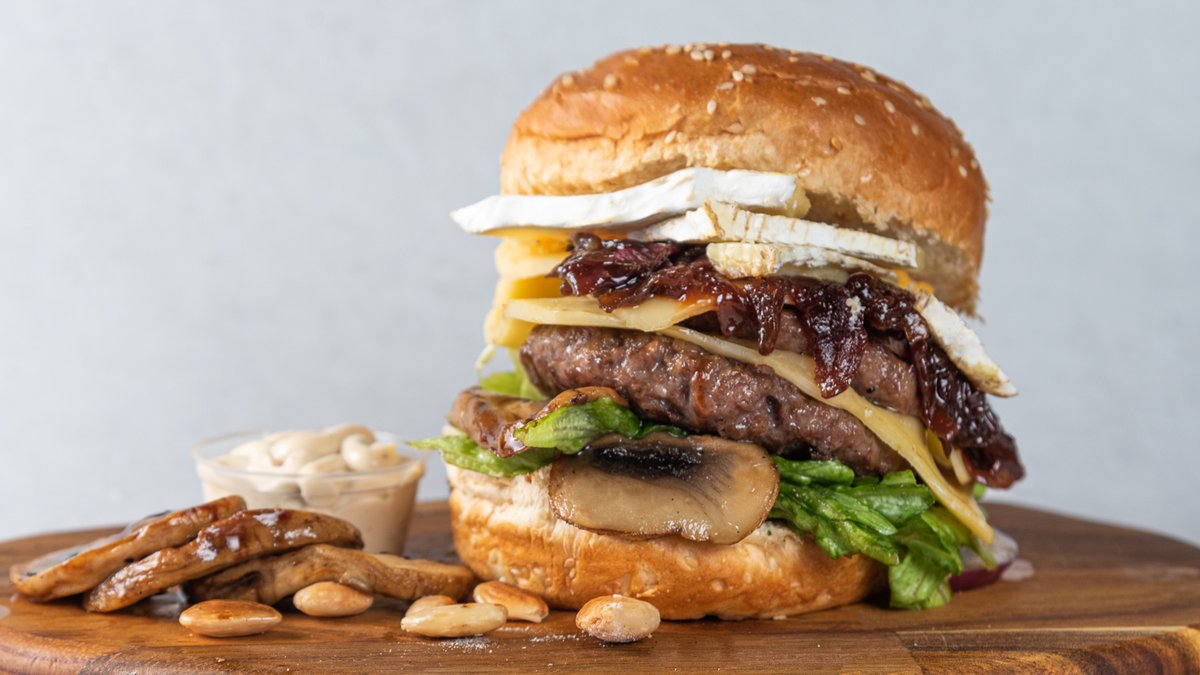190g junećeg mesa, majonez sa tartufima, pečurke, brie sir, ulje od belih tartufa i mix salata.