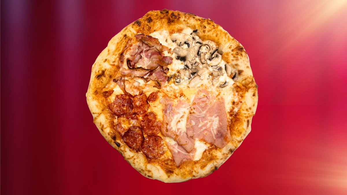 Pelat, gauda kačkavalj, šunka, pečurke i masline