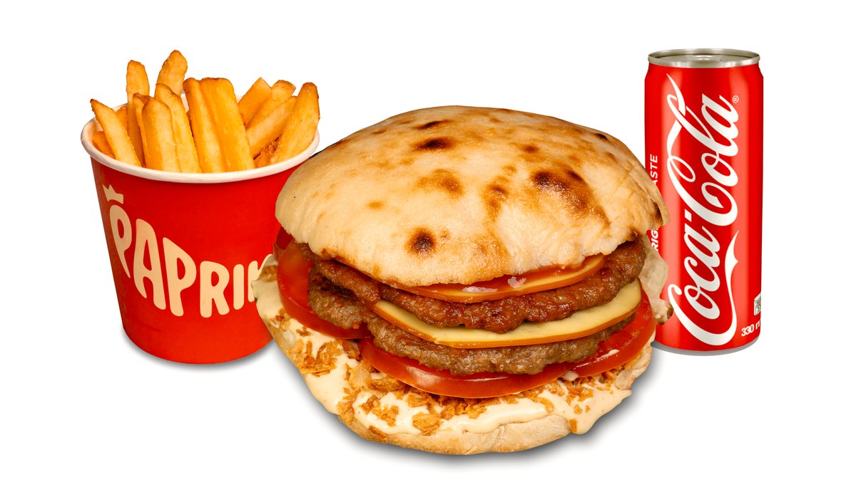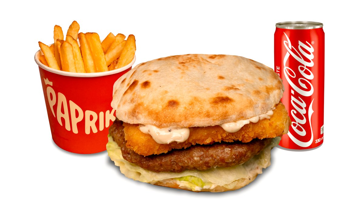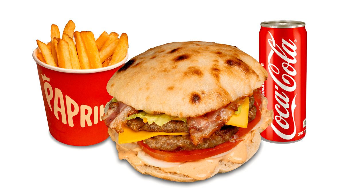 2 x pljeskavica 100g, dimljeni kačkavalj, smokey mayo sos, BBQ sos, hrskavi luk i paradajz
