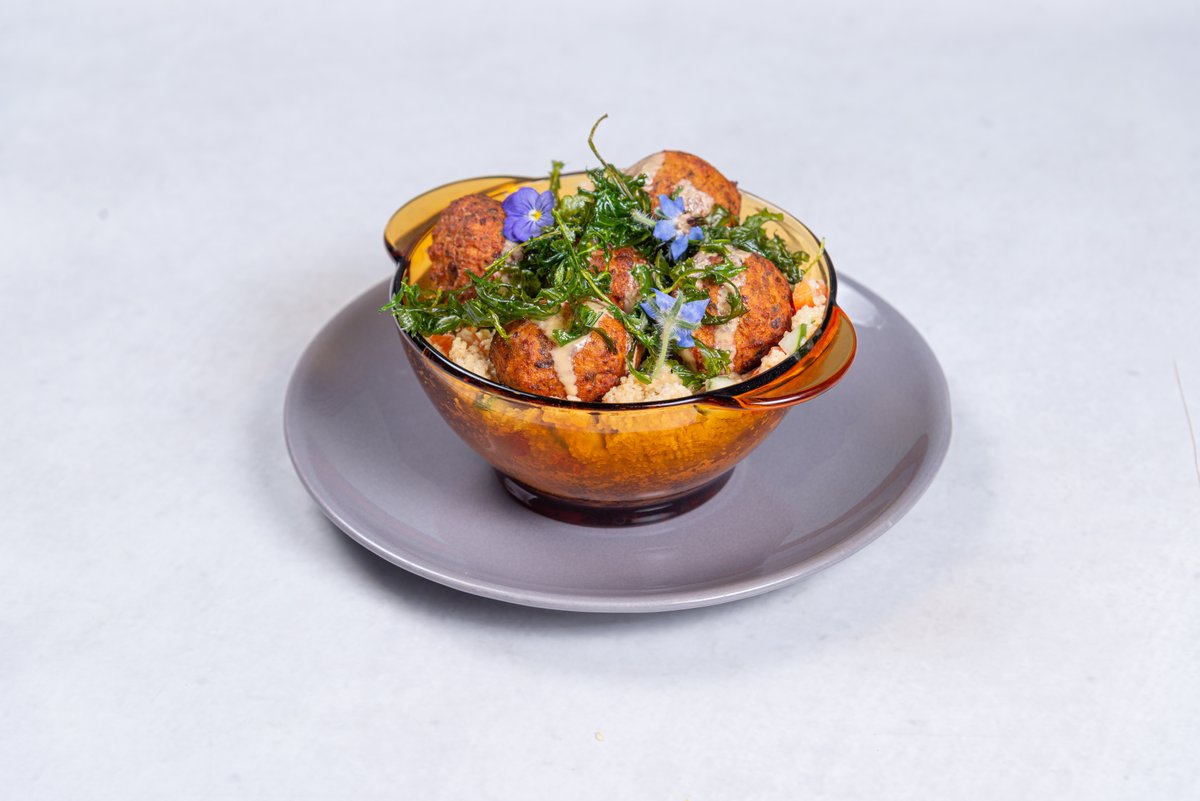 Falafel, mocarela, mayo sa tahinijem, krastavac, kiseli krastavac, paradajz, miks salata, karamelizovani luk