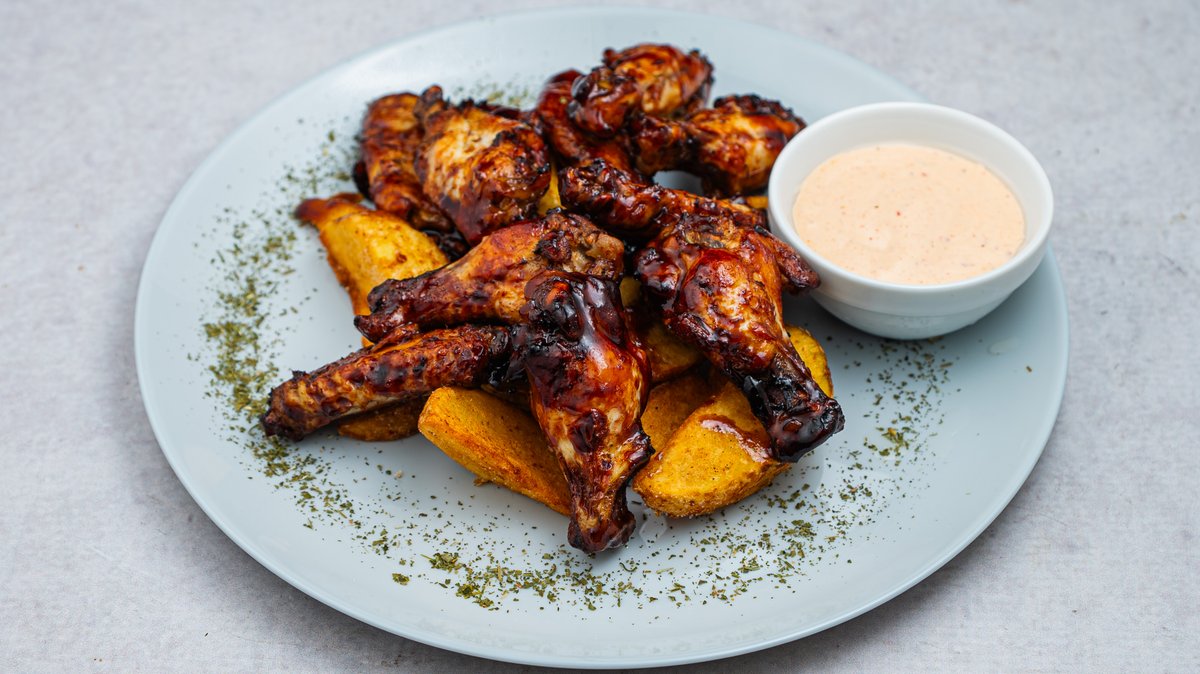 Hrskava pileća krilca u slatko-ljutkastoj marinadi sa medom i daškom rakije, zapečena do savršenstva. Uz njih dolazi ljuti majonez i wedge krompir.