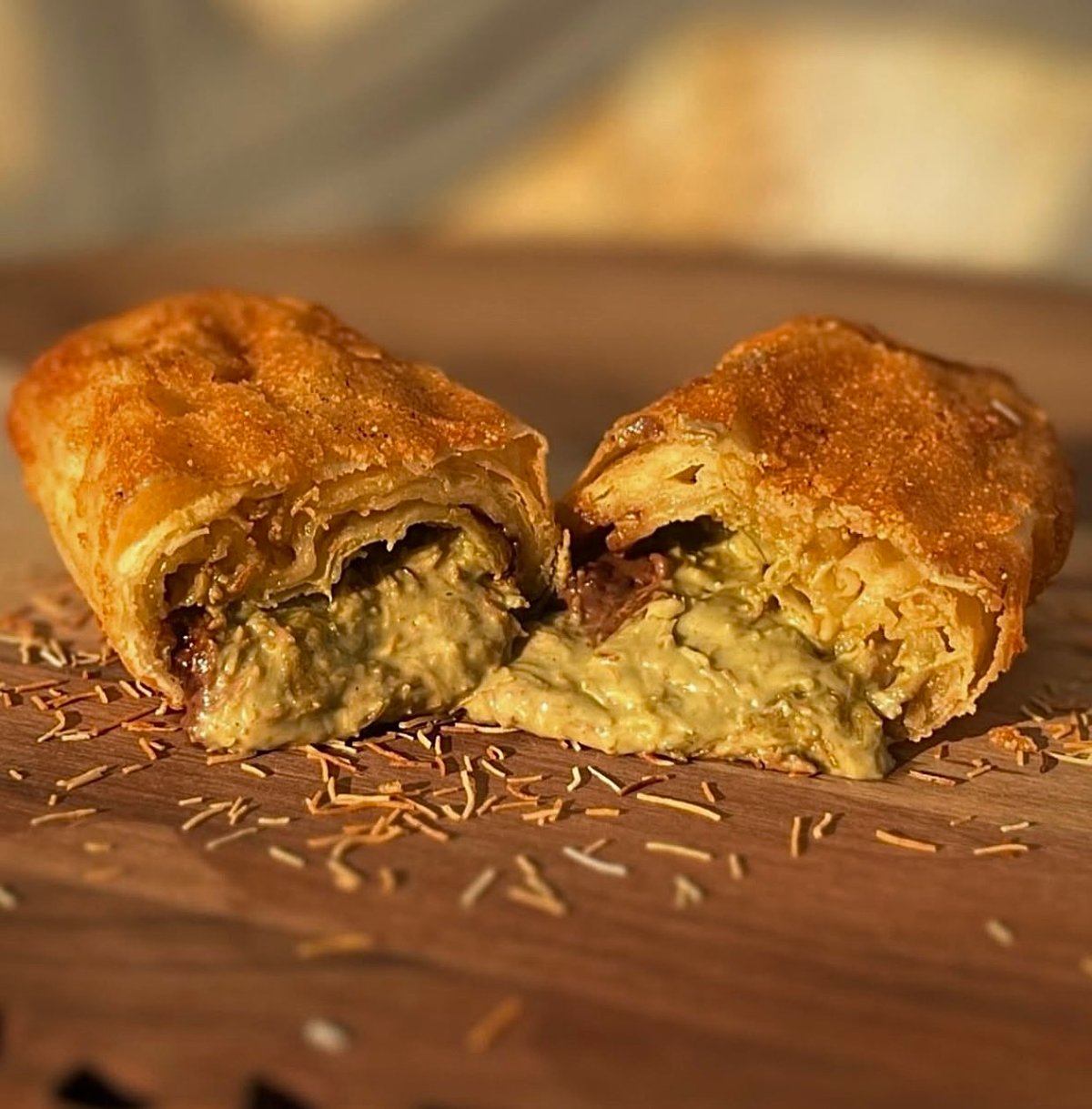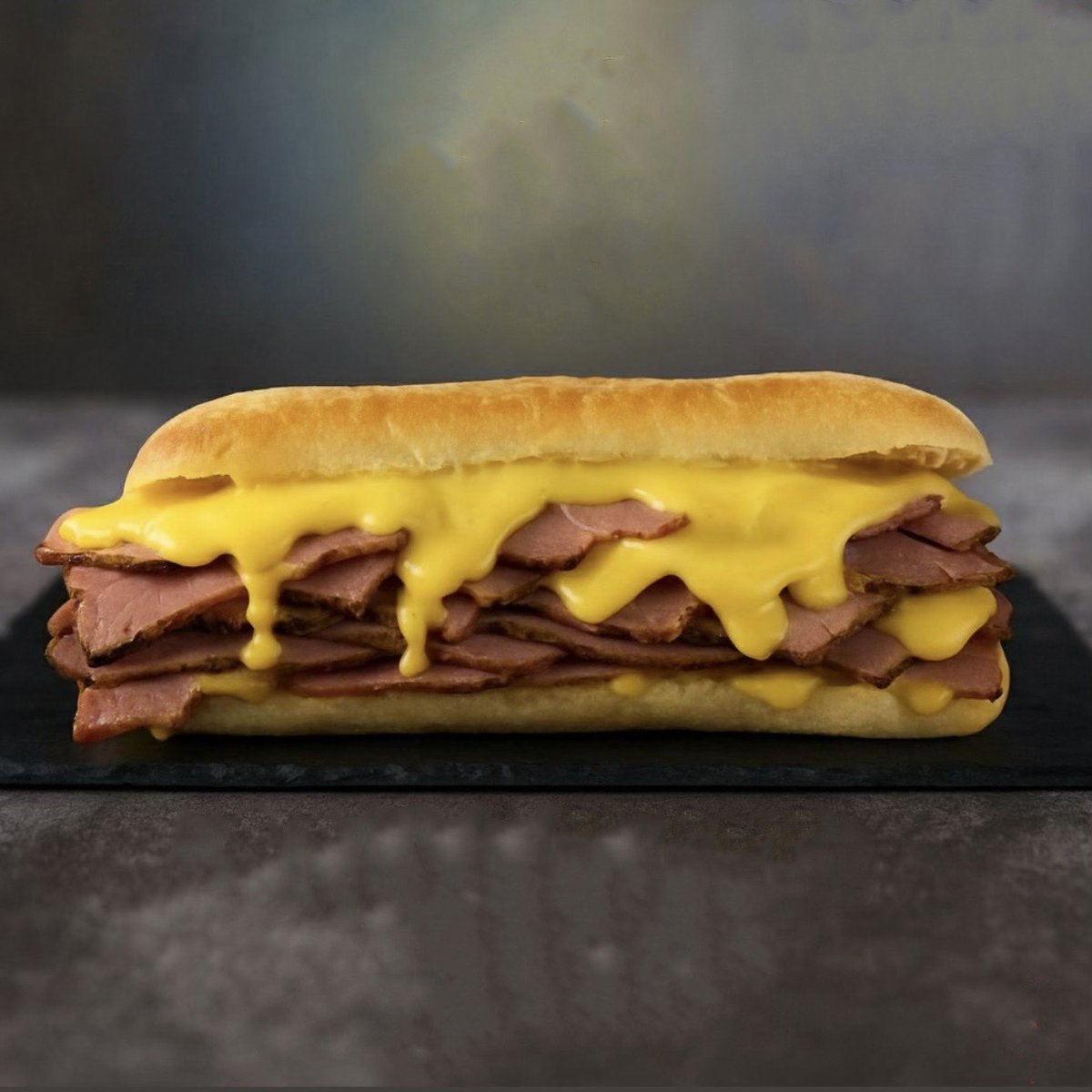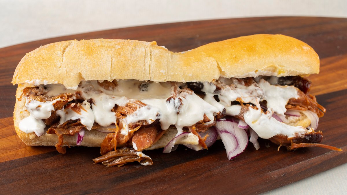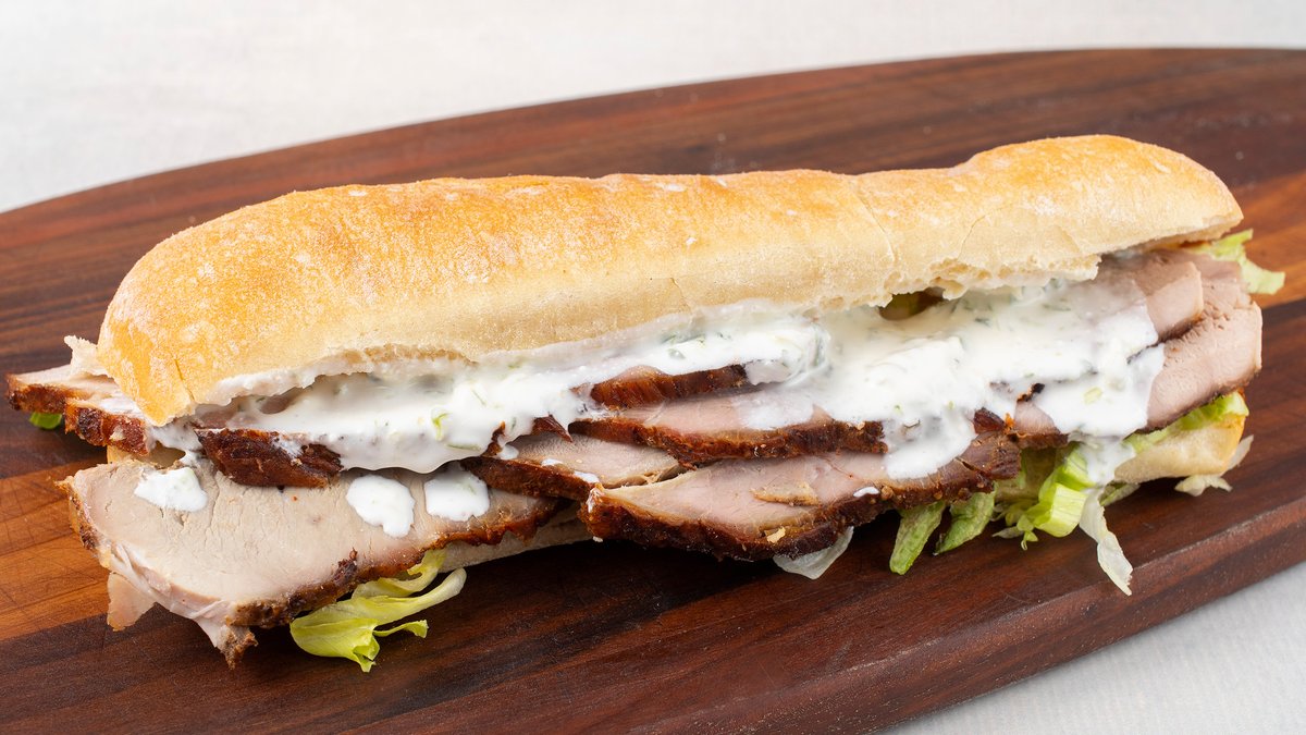 Junetina, ciabatta, namaz, kiseli krastavčići, sos od senfa,