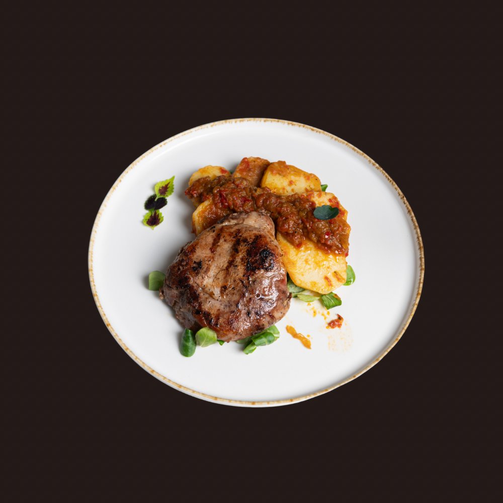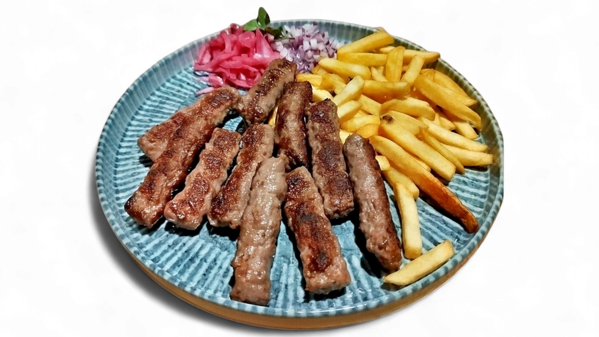 Juneće meso, slanina, crni luk, kačkavalj, tucana paprika, tortilja, pomfrit, ljutenica