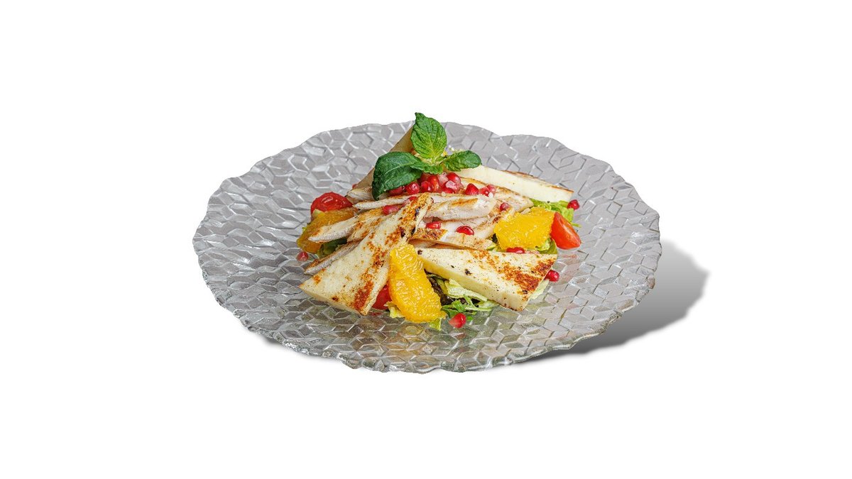 pileći file, mocarela, mix zelenih salata, čeri paradajz, segmenti pomorandže, nar, grilovani miročki sir, limun dresing