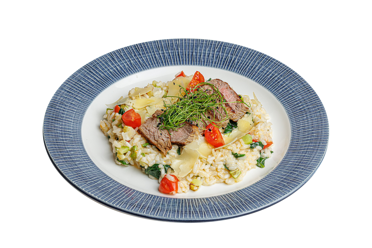 biftek, miks zelenih salata, pecena paprika, parmezan, majonez dresing, ceri paradajzom