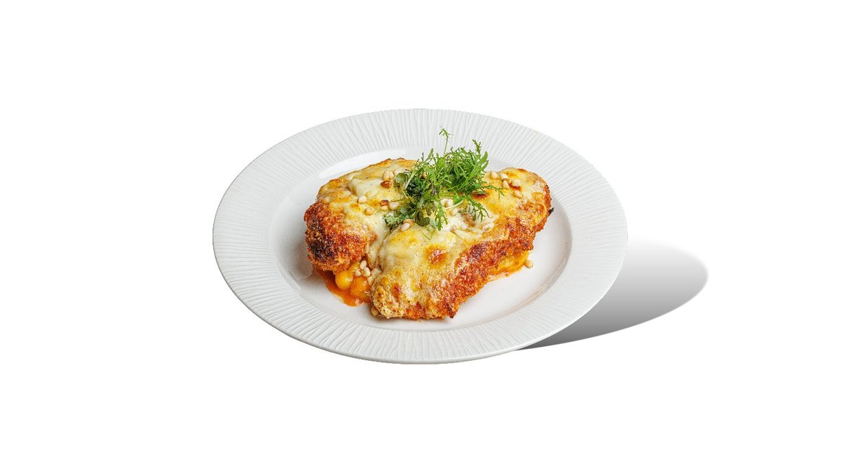 piletina punjena mocarelom, rukolom I cherry paradajzom, rolovano u prsuti sa domacim njokama u pesto sosu