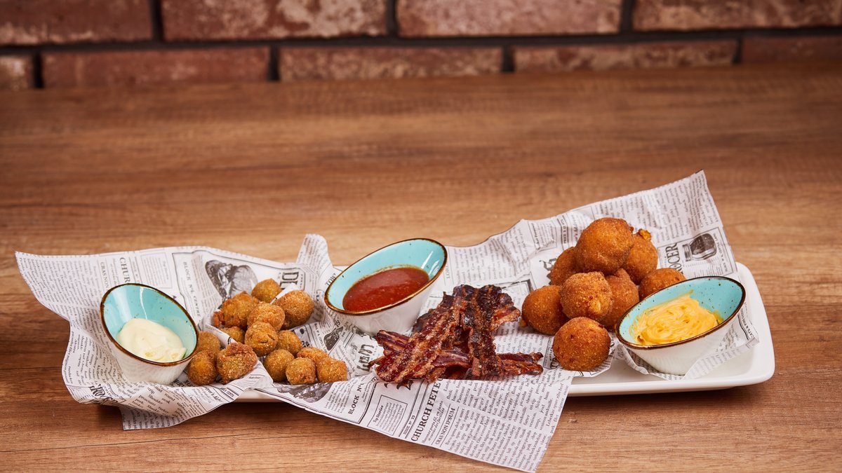 Fried olives, fried mac & cheese balls, kandirana chips slanina, with Aioli, nacho cheese & spicy ketchup sauces