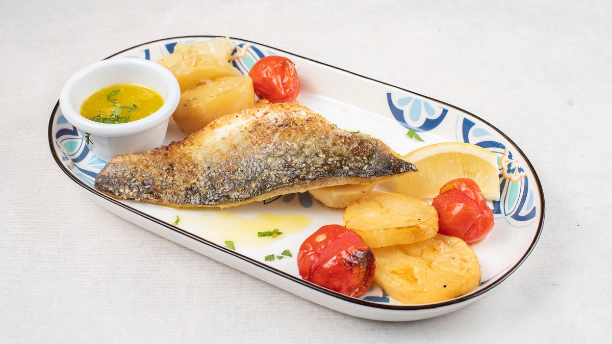 Brancin filet (130g) pečen u rerni sa krompirom, čeri paradajzom i aromatizovanim začinom