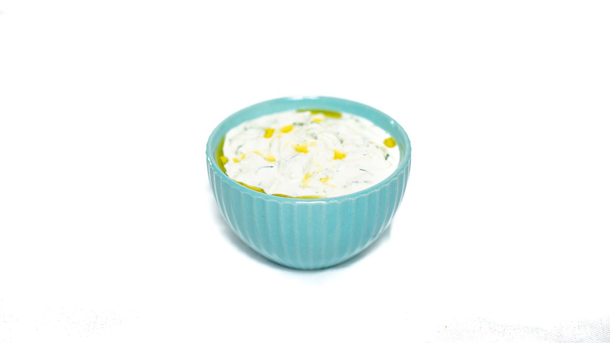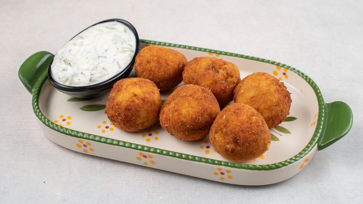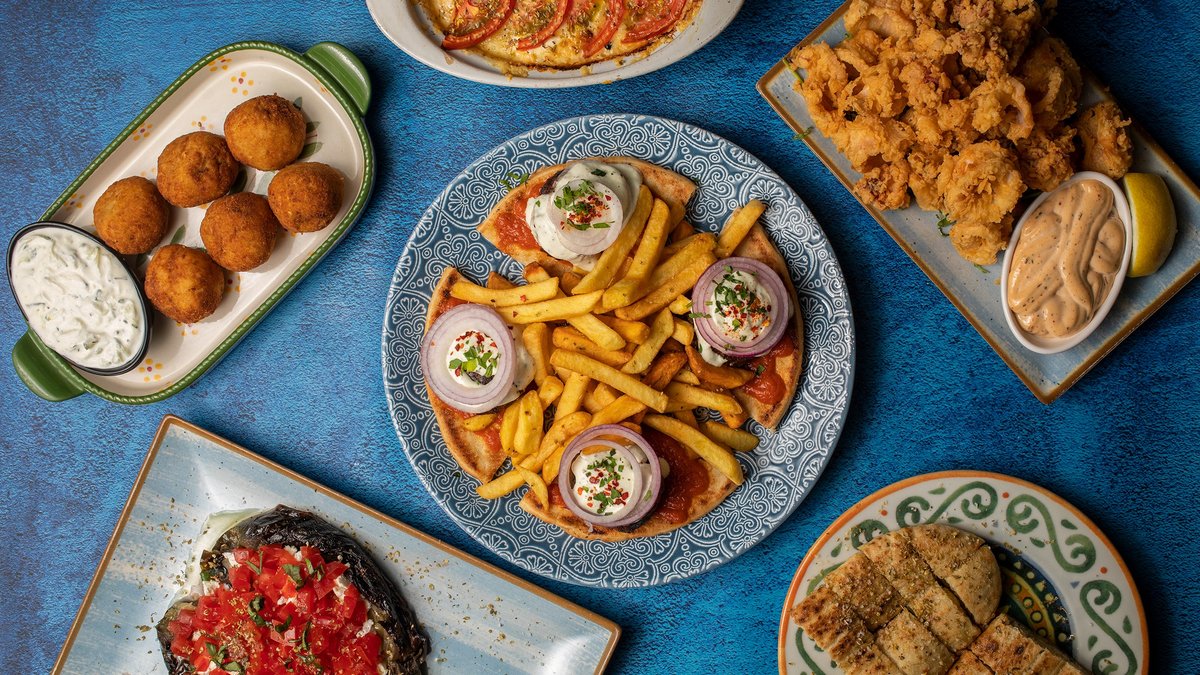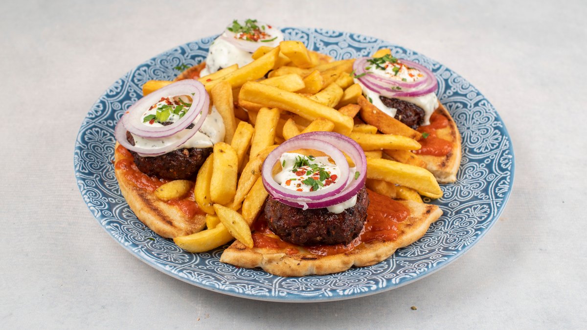 Ćufte od začinjenog mlevenog mesa, sos od grčkog jogurta, paradajz sos, pita hleb i pomfrit.
