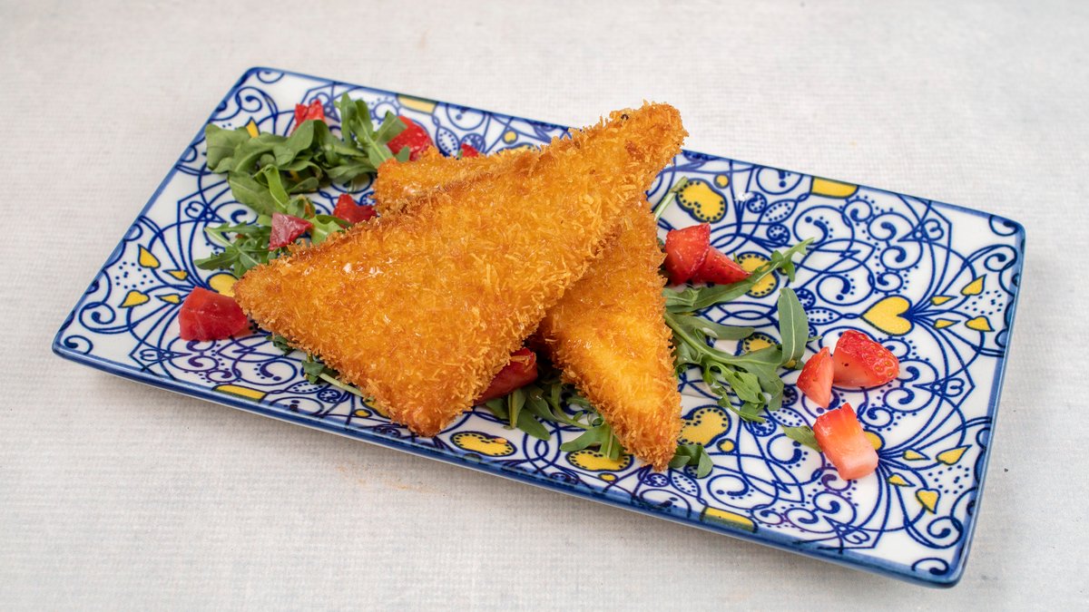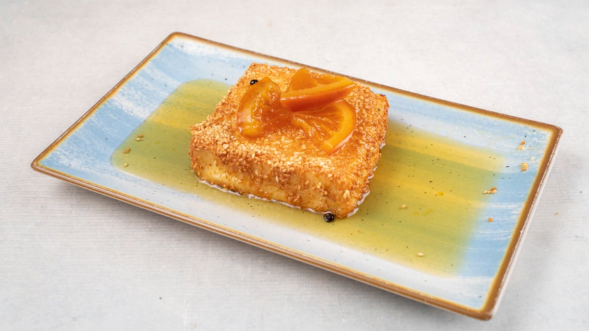 Pržena feta u susamu, sirup od ljute papričice i pomorandže