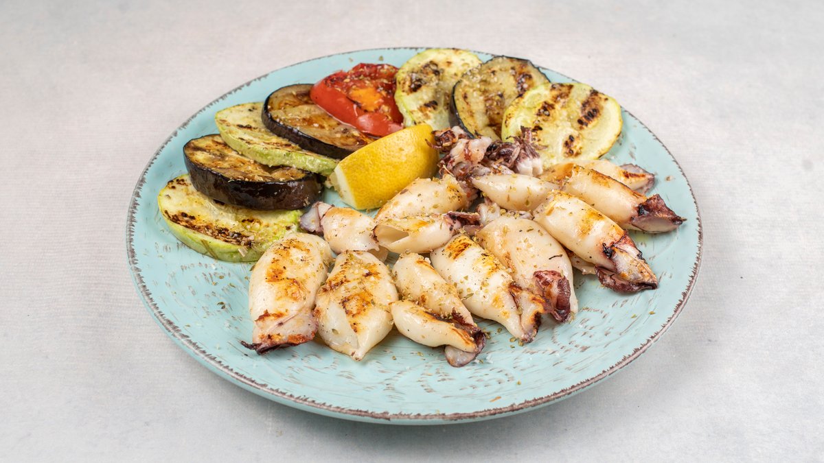 Punjene grilovane lignje (300g) sa feta sirom, pesto sos i paradajz