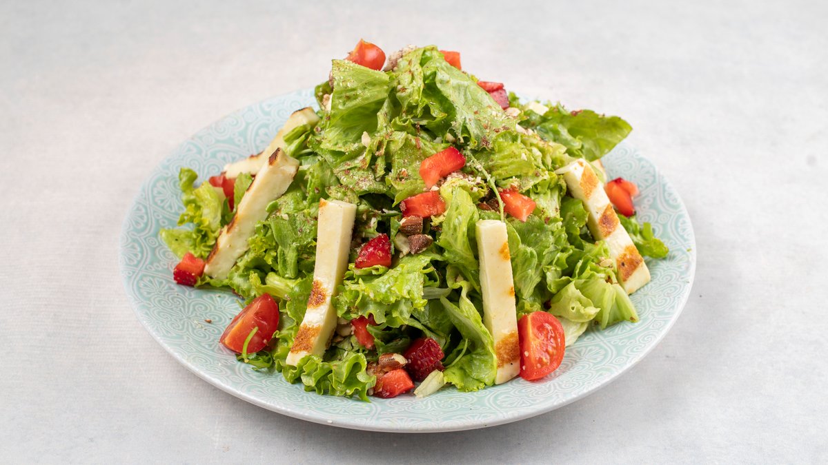 Mix zelenih salata sa grilovanim halumi sirom, sezonskim voćem, bademima i dresingom od limuna (250g)