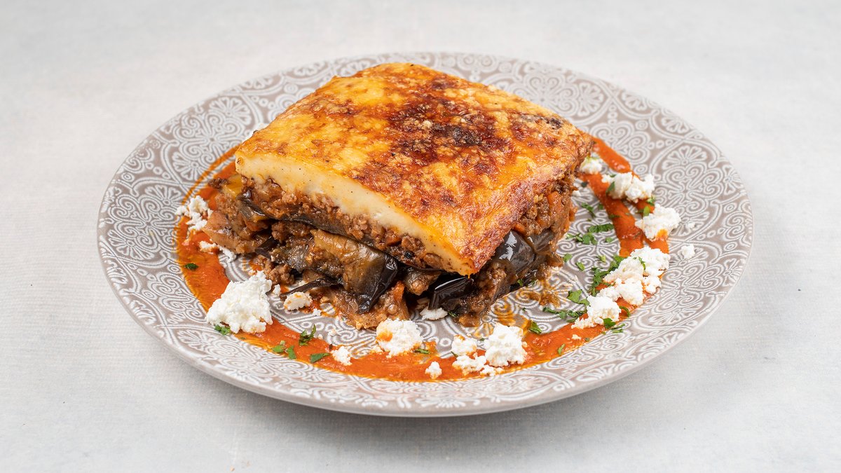 Musaka sa mlevenim mesom, patlidžanom, krompirom, bešamel sosom, feta sirom.