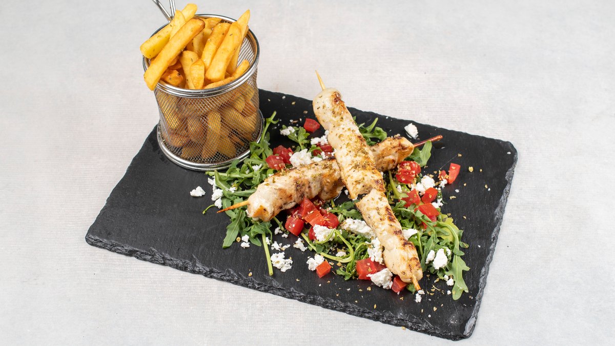Pileći ražnjići (200g) servirani na rukoli, sa kockicama paradajza & feta sirom uz pržene krompiriće