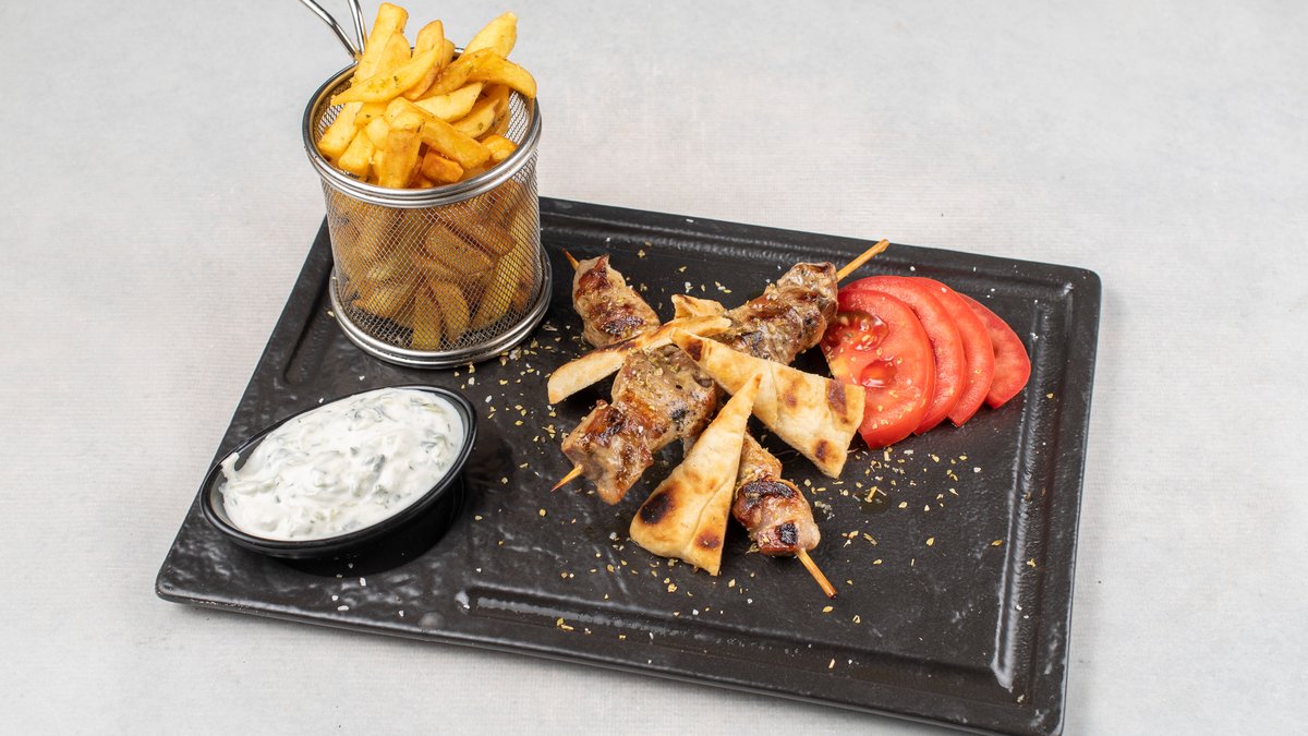 Svinjski ražnjići uz pita hleb tzatziki, salatu, paradajz, crveni luk i pržene krompiriće
