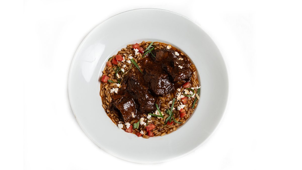 Sporo kuvana junetina (180g) u paradajz sosu sa pireom od patlidžana, ili sa domaćom testeninom «manestra», grčkim feta sirom i bosiljkom