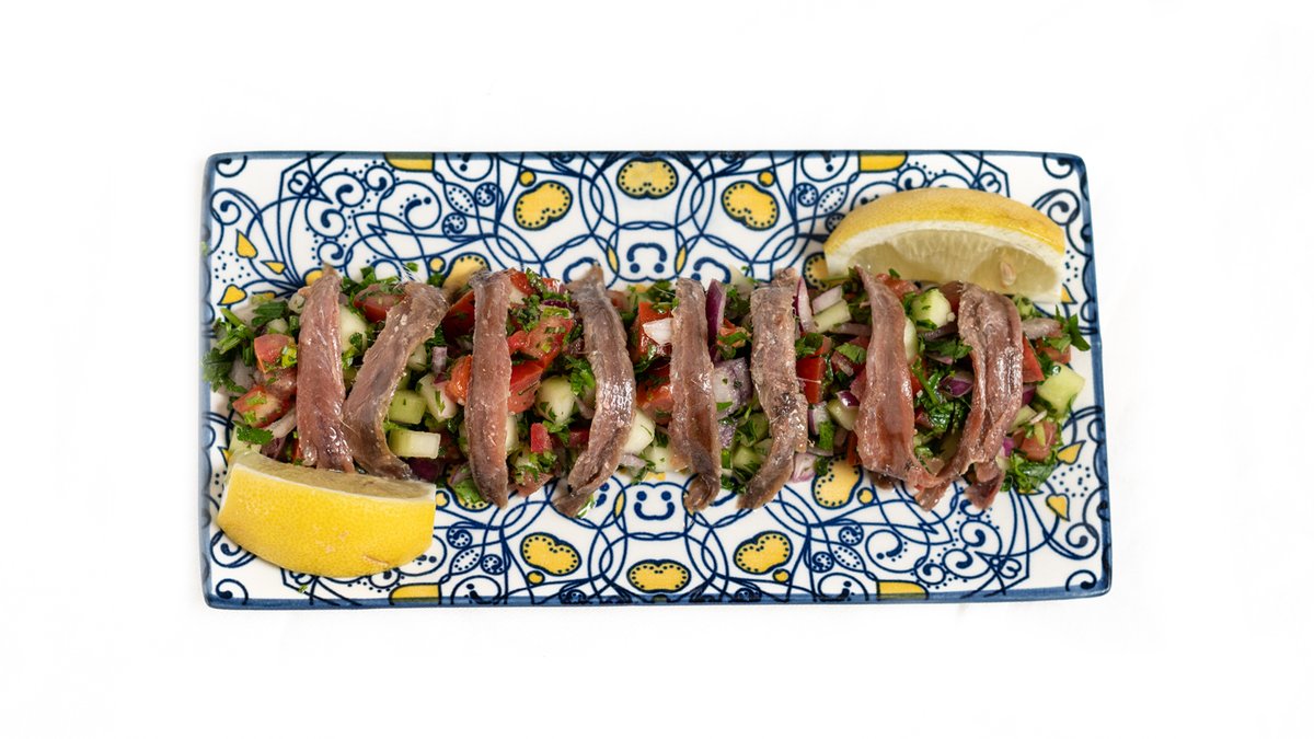 usoljeni inćuni sa svežom salaticom od kockica paradajta, krastavca i crvenog luka, peršuna, nane