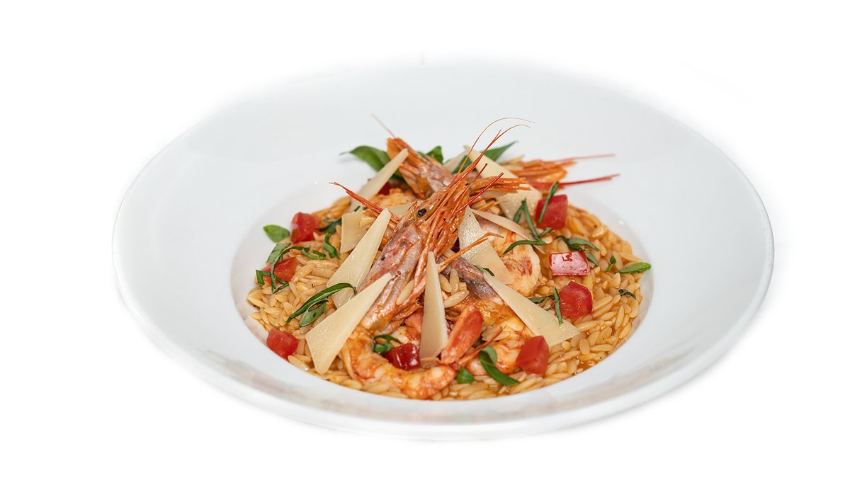 Gambori (180g) u crvenom sosu sa Metaxom, manestrom (kritharaki pasta) i parmezanom (blago ljuto)