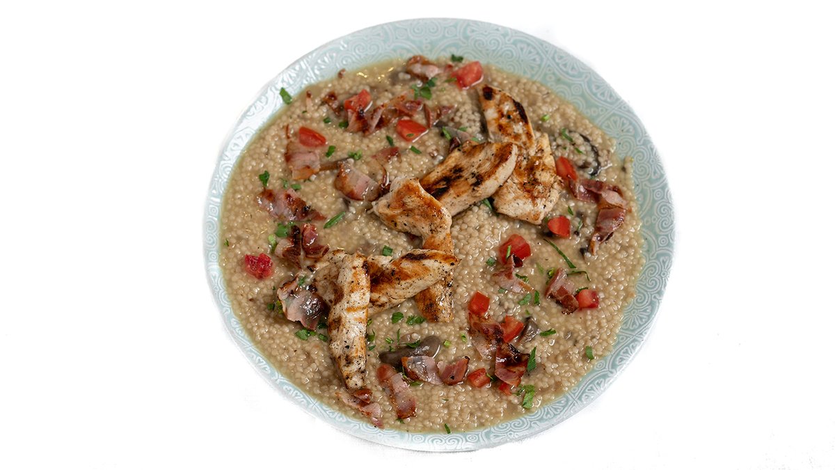 Aromatizovani pileći file (200g) sa domaćom testeninom "trahanas", pečurkama i hrskavom slaninom (ala rižoto