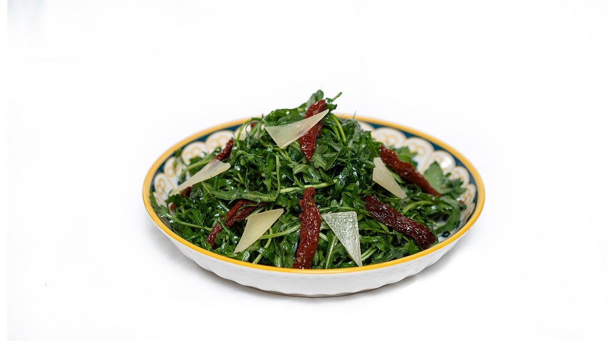 salata od sveže rukole, sušeni paradajt, listići parmezana, dresing aceto balzamico