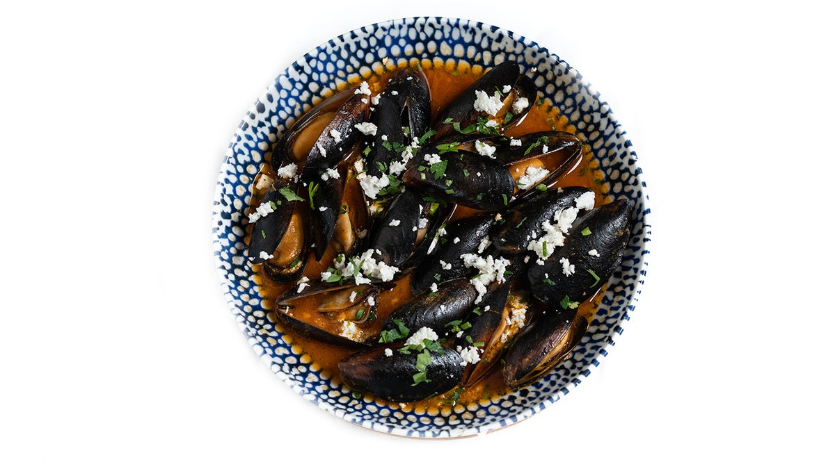 Dagnje na tiganju (250g) u sosu od paradajza, sa uzom i feta sirom