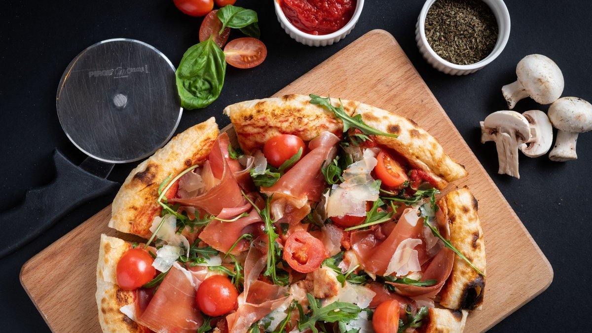 pelat, mozzarella, pršuta, kozji sir, rukola, čeri paradajz, parmezan, maslinovo ulje