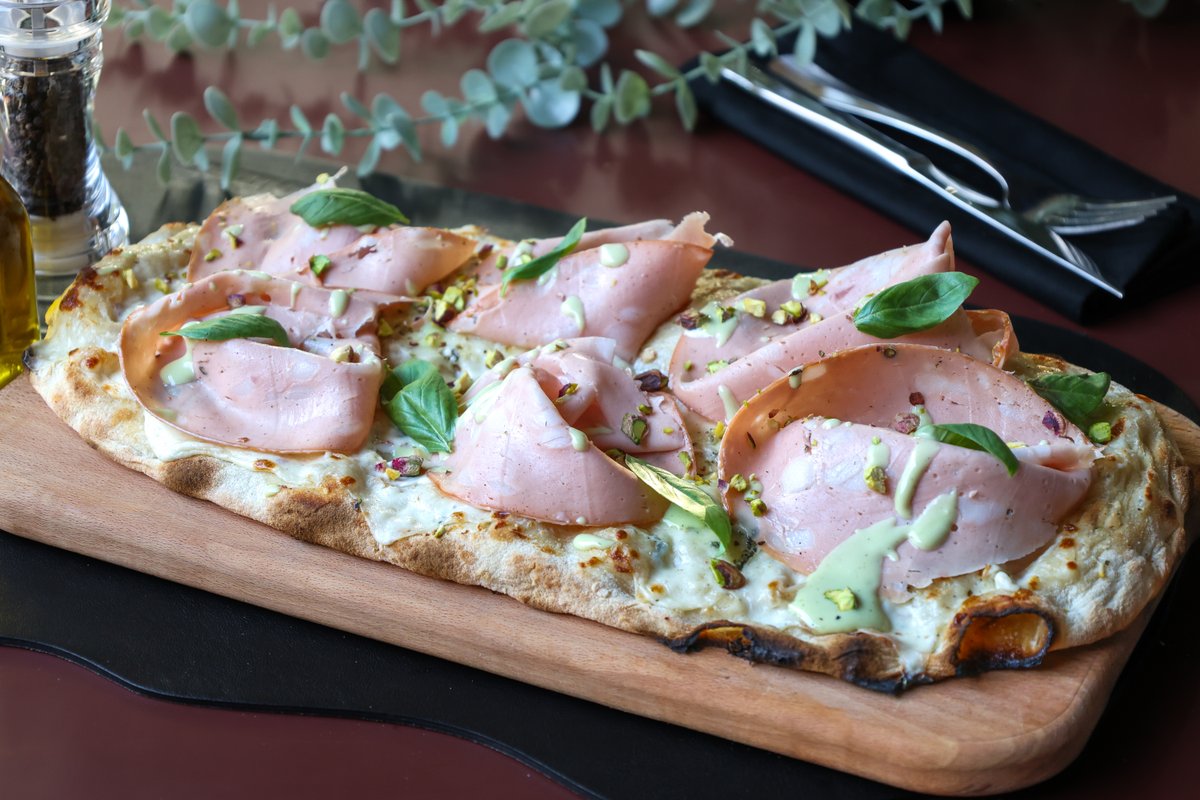 Pavlaka sos, rikota, mocarela, mortadela, pistaći sos, bosiljak, mrvljeni pistaći