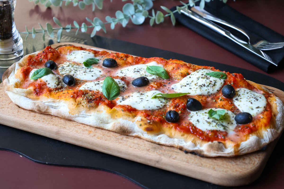 Pelat, mocarela, parmezany, bosiljak, crne masline, origano