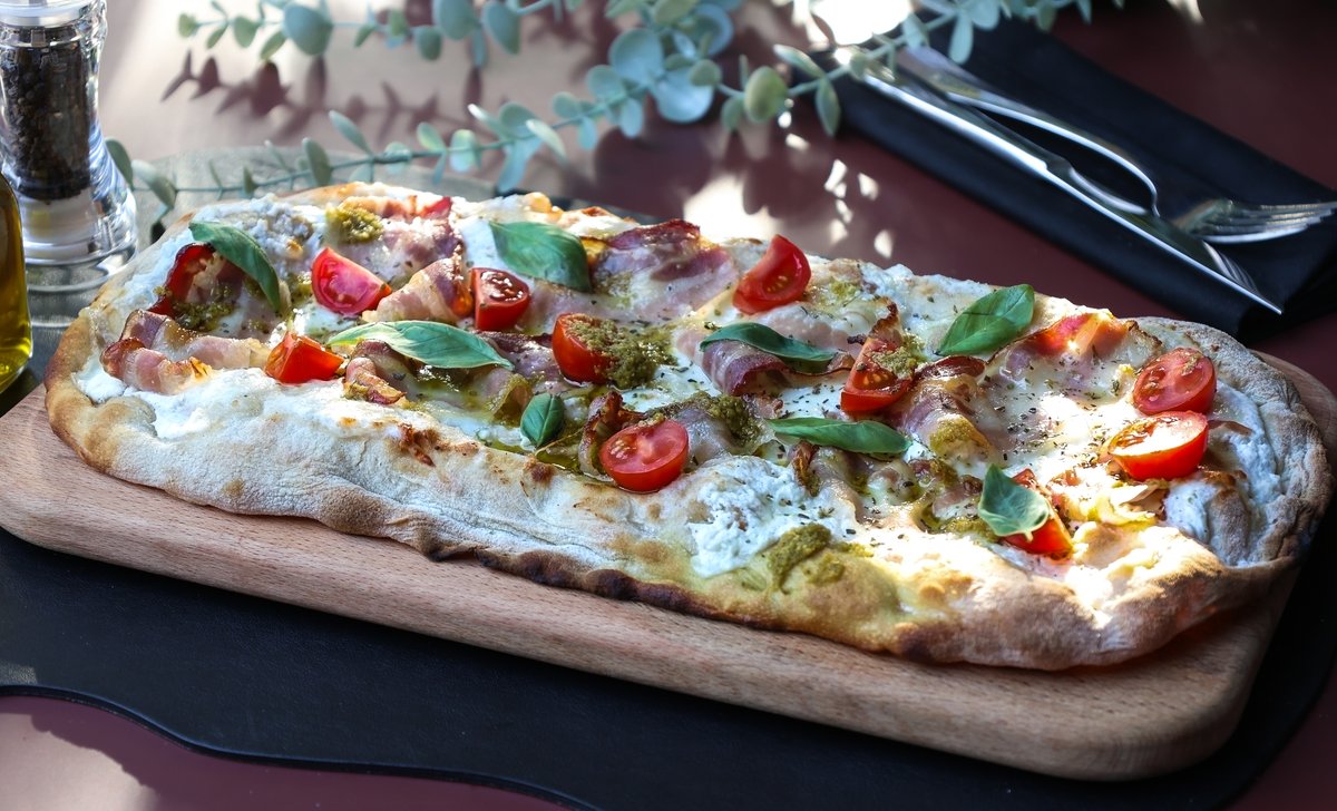 Pavlaka sos, rikota, mocarela, pesto sos, pančeta, bosiljak, cherry paradajz