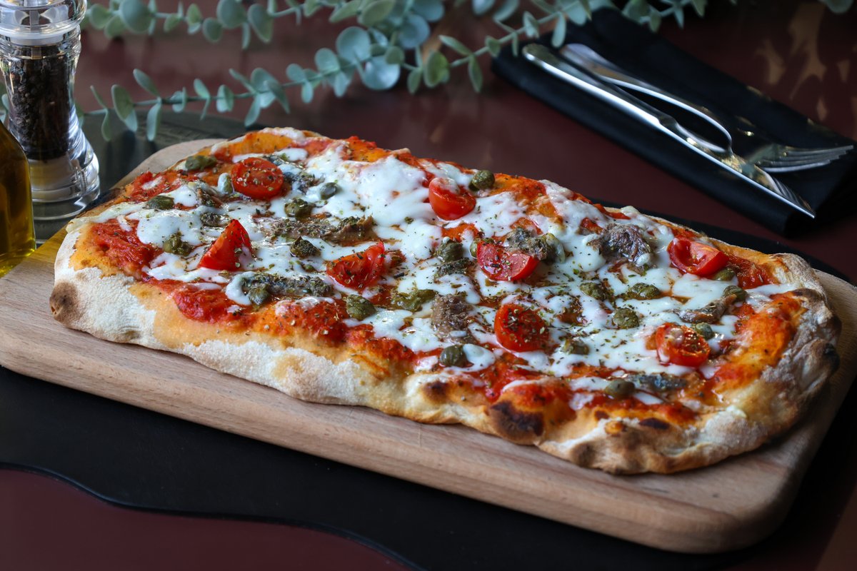 Pelat, mocarela, crne masline, kapar, inćuni, ulje od belog luka, bosiljak