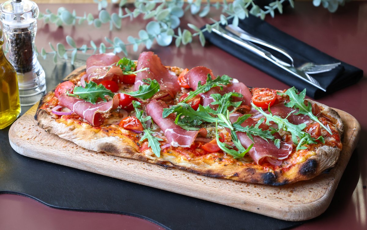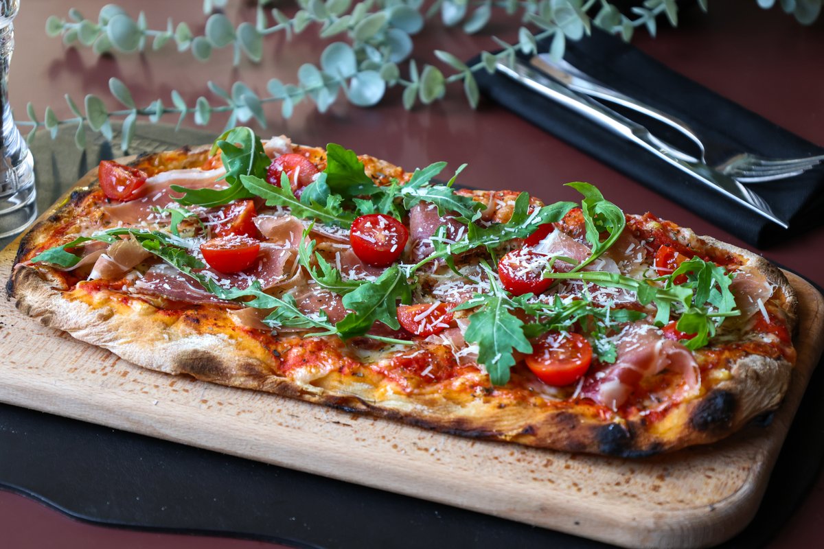 Pelat, mocarela, crveni luk, rukola, goveđa pršuta, cherry paradajz