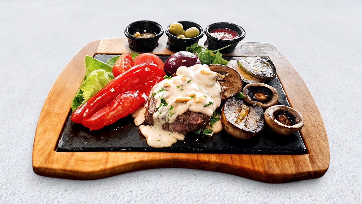 Biftek u sosu od bibera, zapečen krompir u ljusci, grilovano povrće